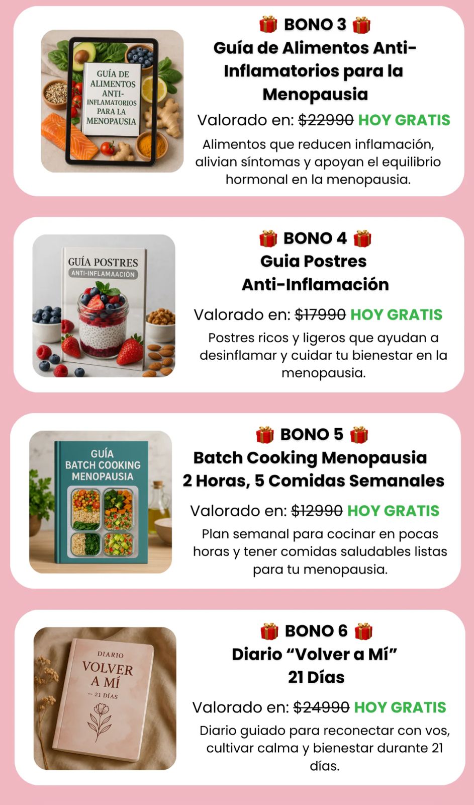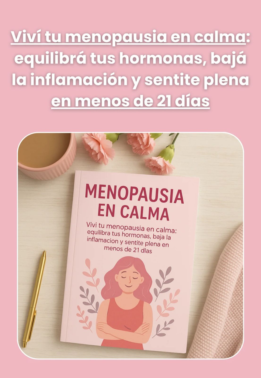 Vas a recibir el ebook Menopausia en Calma en formato digital PDF, más todos los bonos exclusivos incluidos en esta oferta especial (recetarios, plan de 21 días, plantillas, guías y recursos de apoyo).