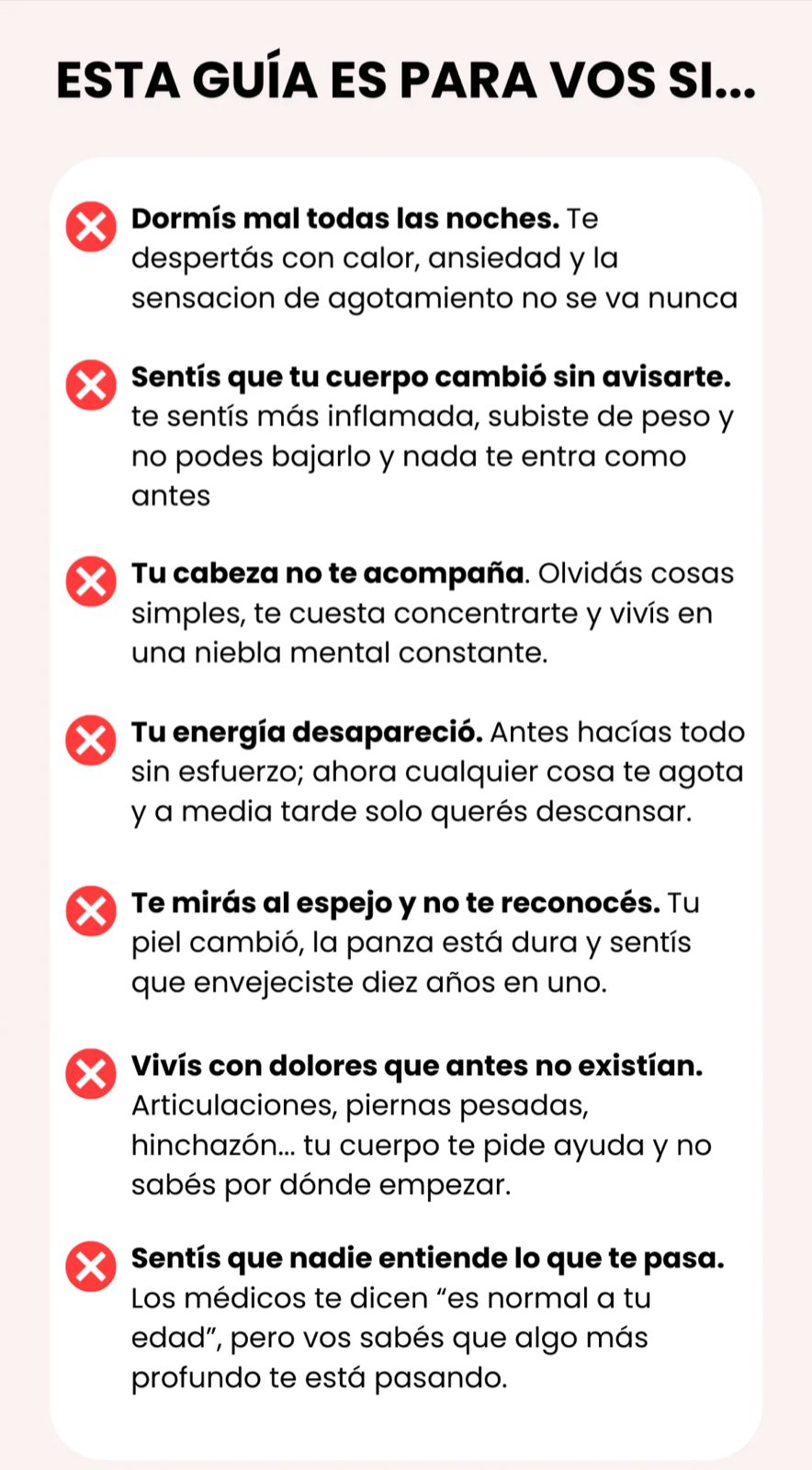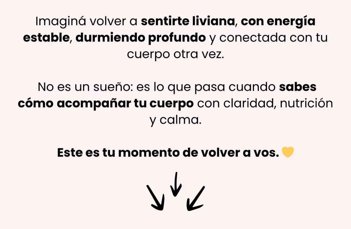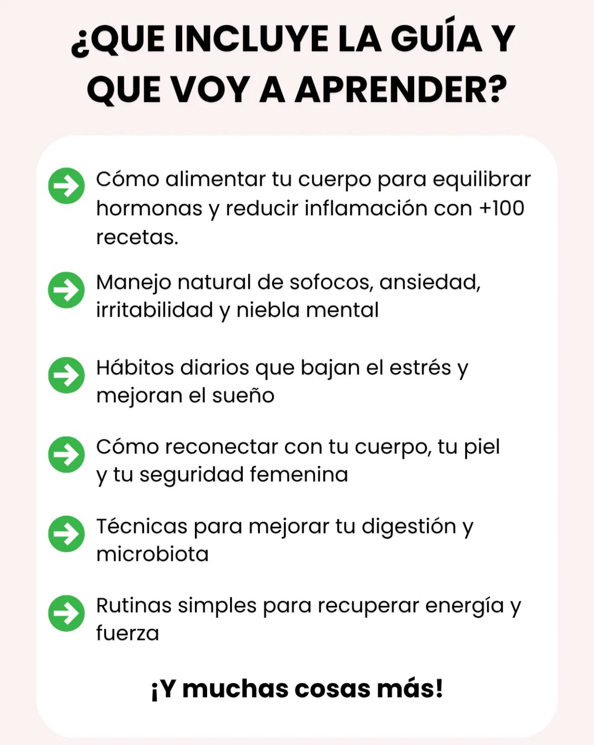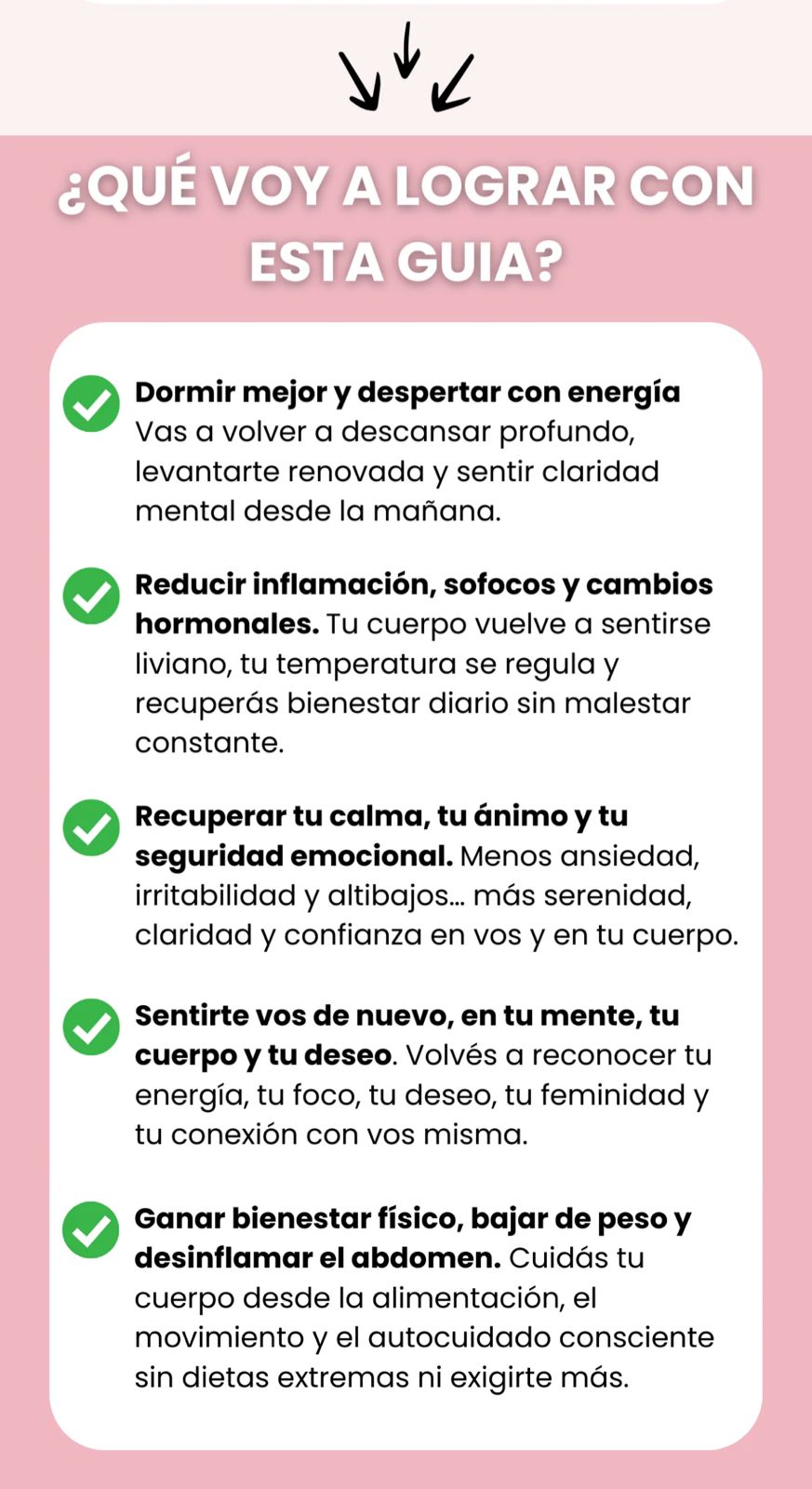 No. Esta guía está diseñada para acompañarte con alimentación, hábitos y bienestar emocional basados en evidencia, pero no reemplaza el acompañamiento médico o profesional individual cuando sea necesario. Consultá siempre a un profesional de la salud antes de realizar cambios en tu alimentación, ejercicio o suplementación.